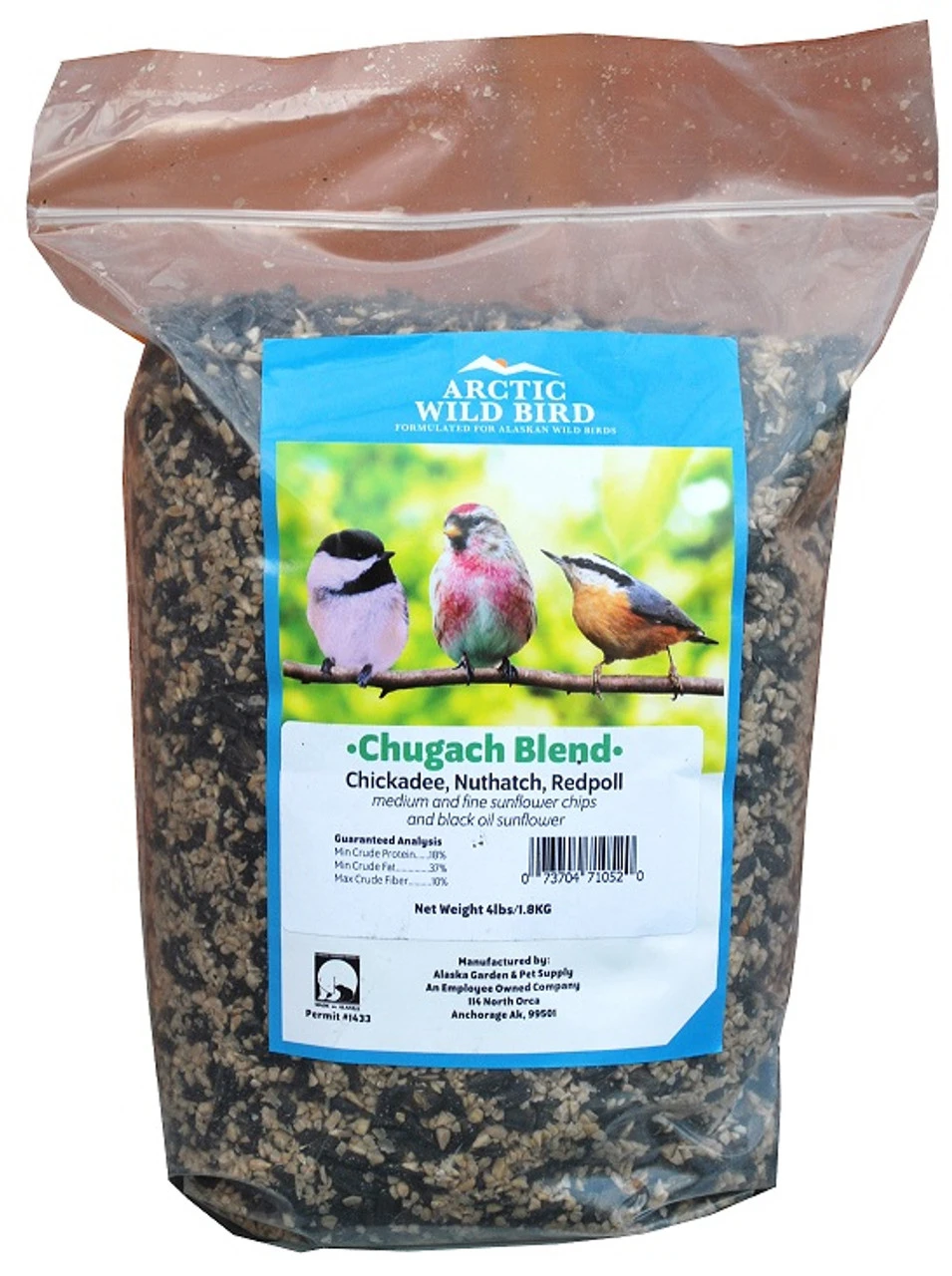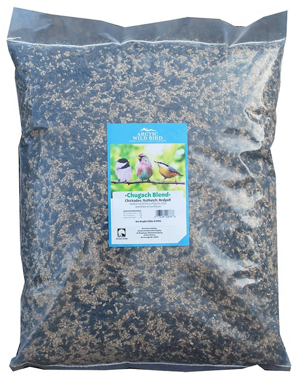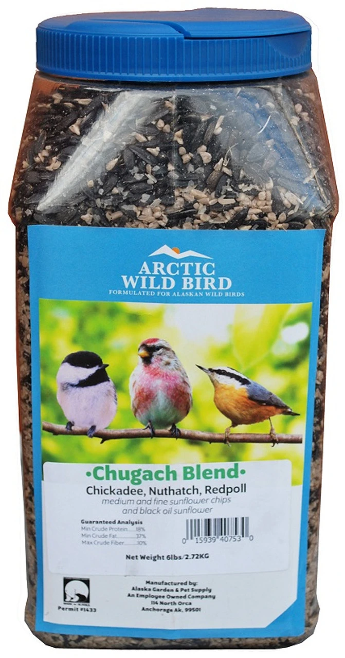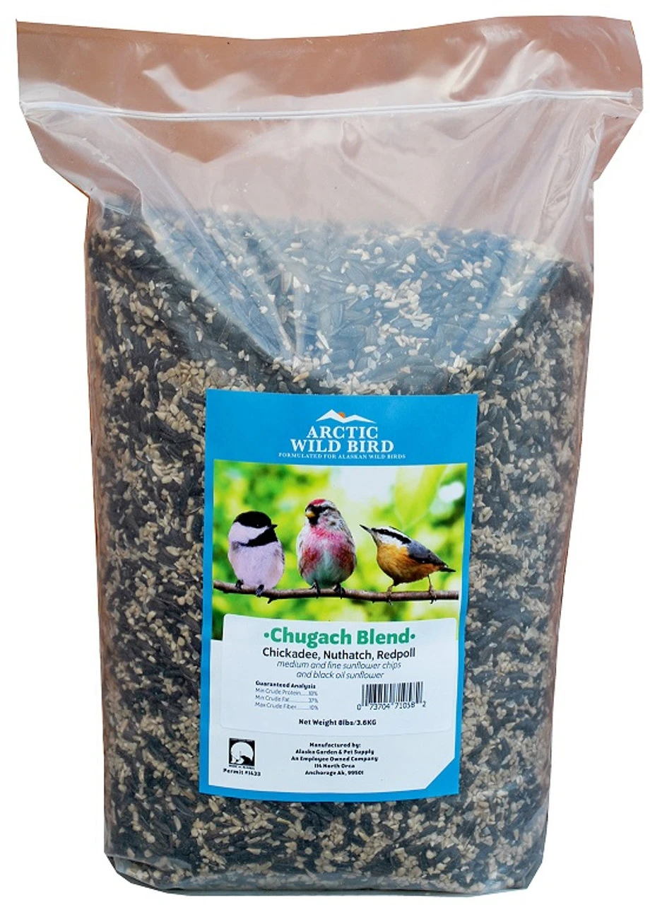 Artic Wild Bird Chugach Blend attracts birds like Steller’s Jays, Pine Siskins, Nuthatches, and Chickadees. The high content of these birds’ favorite seeds, like sunflower chips and black oil, make for a busy feeding station.