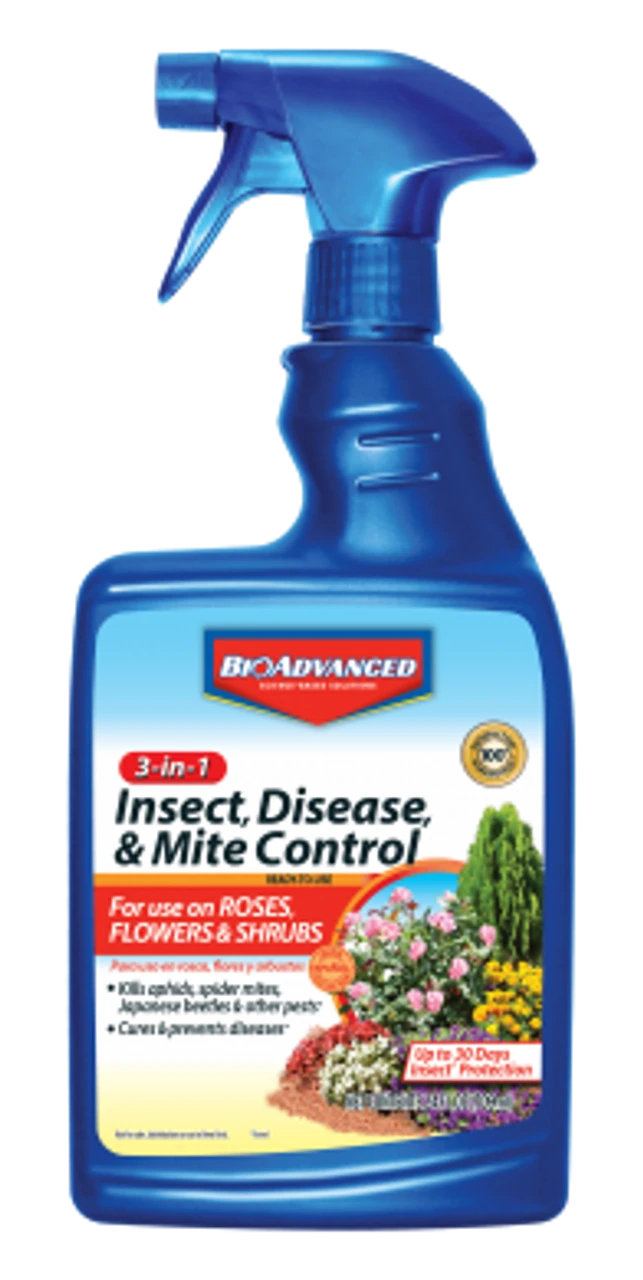 Controls destructive Japanese Beetles, Aphids, Caterpillars, Whiteflies and other listed pests. Protects against Black Spot, Anthracnose, Leaf Spot, Petal Blight, Powdery Mildew, Rust and Scab. Kills Spider Mites and other listed insects on contact and keeps killing up to 30 days.