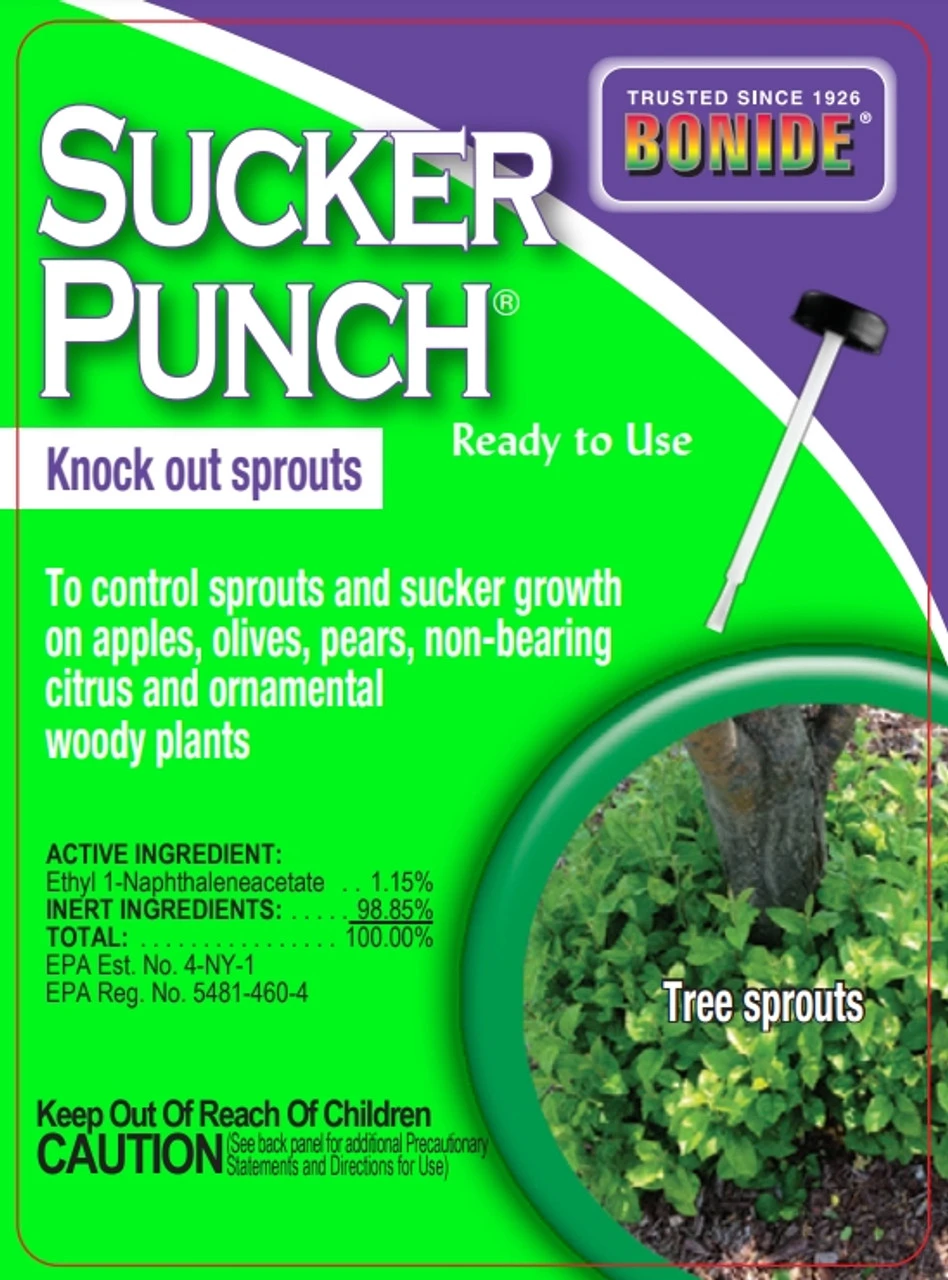 BONIDE Sucker Punch® is the fast and easy way to prevent and control unwanted plant suckers and sprouts. It is a growth regulator that can be used on the base of trees and shrubs, in the canopy and on the trunk of trees. Excellent training tool to promote the growth and development of strong, well spaced branches that resist wind and ice damage, improve spray penetration for better insect and disease control and improve light penetration for better overall growth.