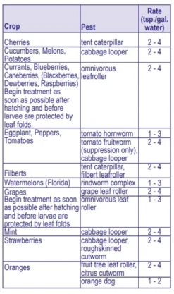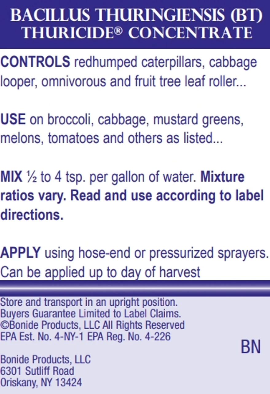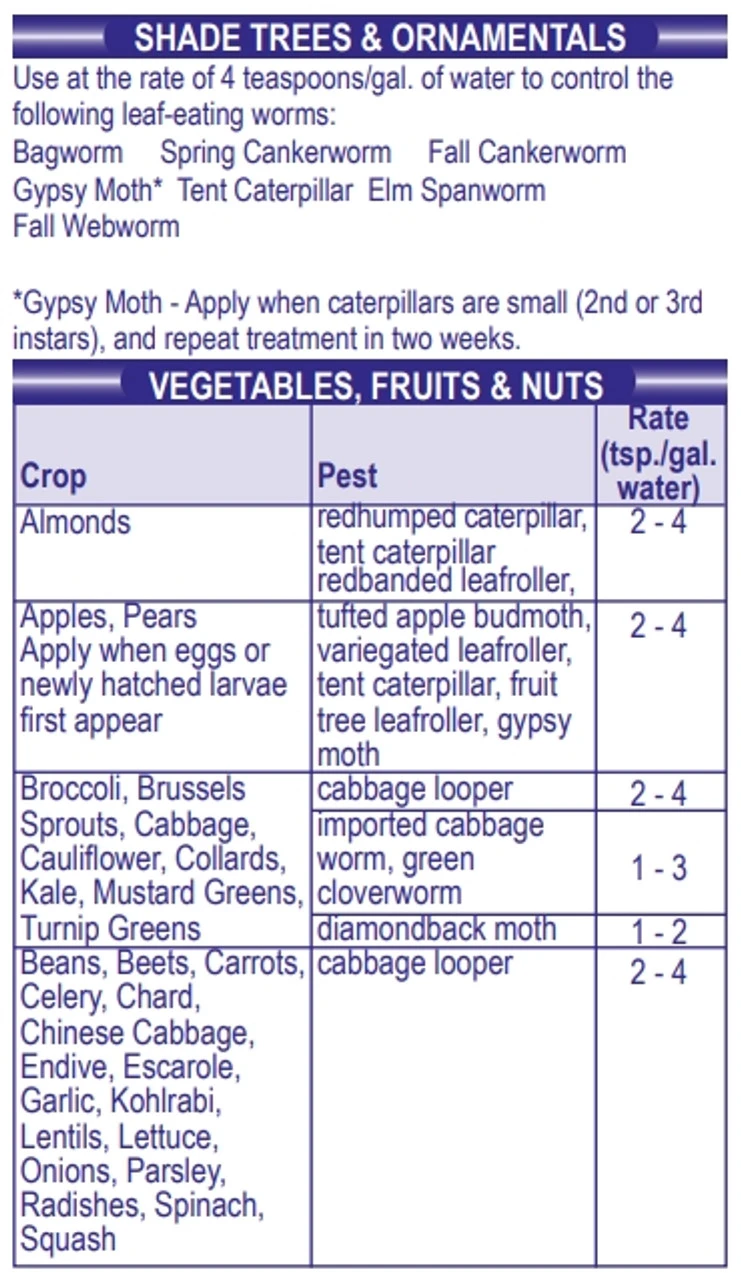 - PROTECTS VEGETABLES, FRUITS, NUTS, SHADE TREES & ORNAMENTALS – Thuricide is designed for use on a variety of plants including almonds, apples, pears, cherries, grapes, oranges, celery, broccoli, cabbage, pecans plus shade trees and ornamentals.