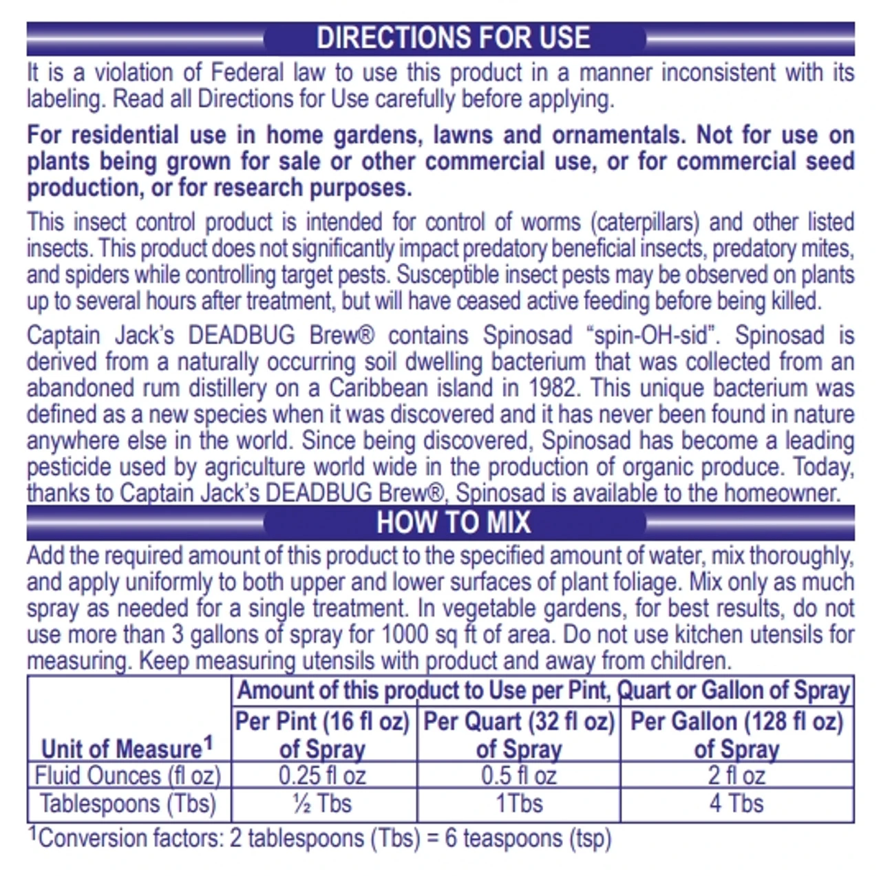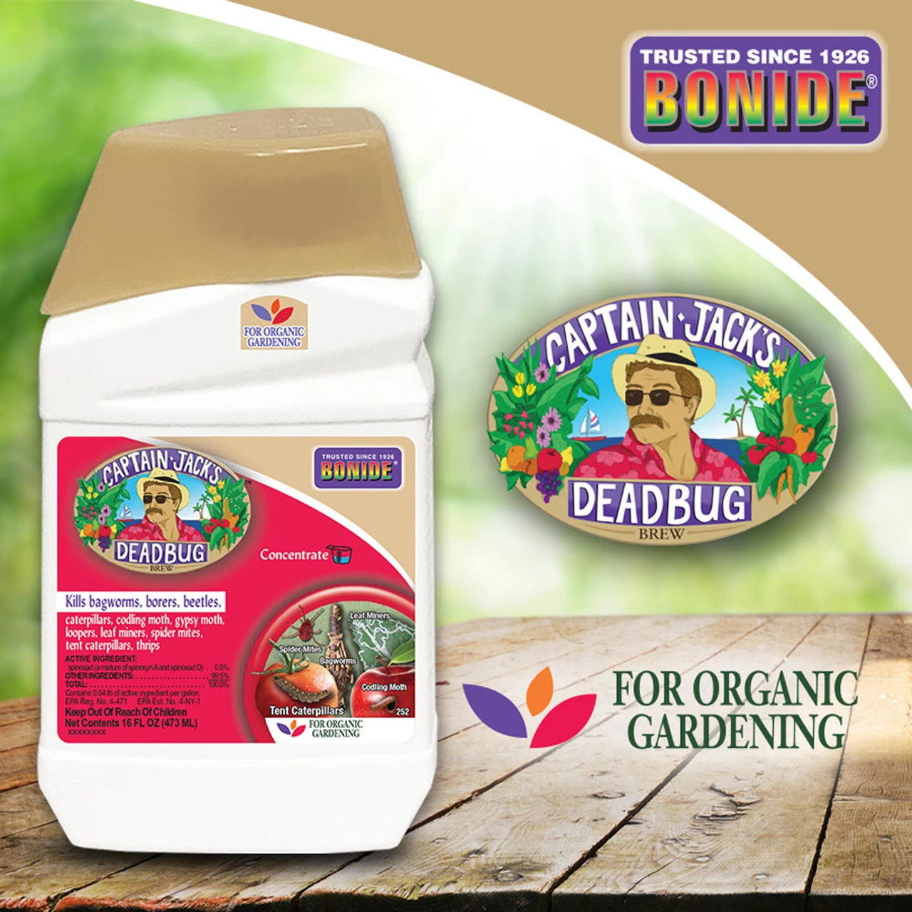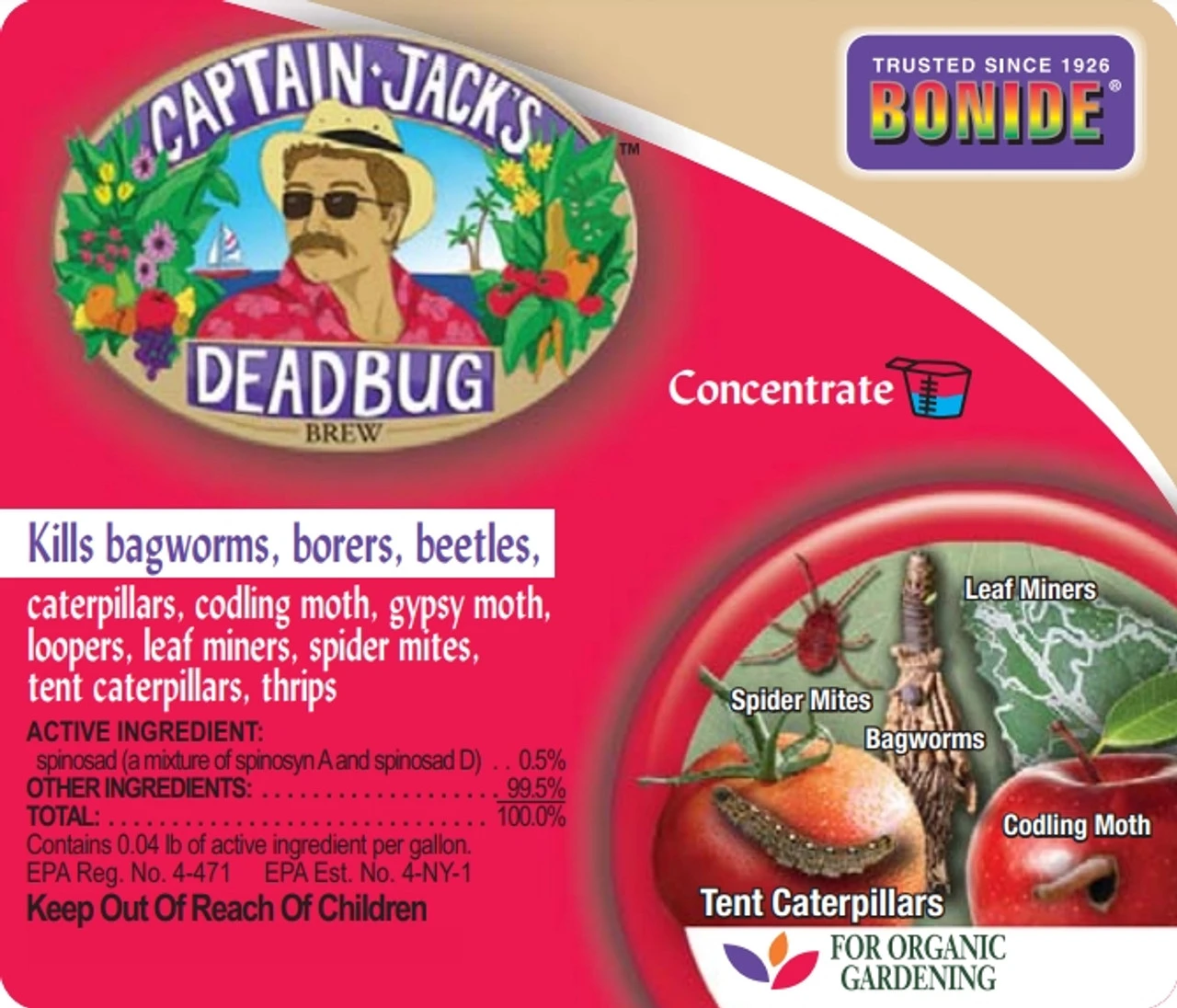 Bonide Captain Jack’s™ Deadbug Brew is approved for organic gardening to control a wide range of listed insect pests. Use on listed vegetables, citrus, fruits flowers, and ornamentals. Contains Spinosad®. For outdoor use only.