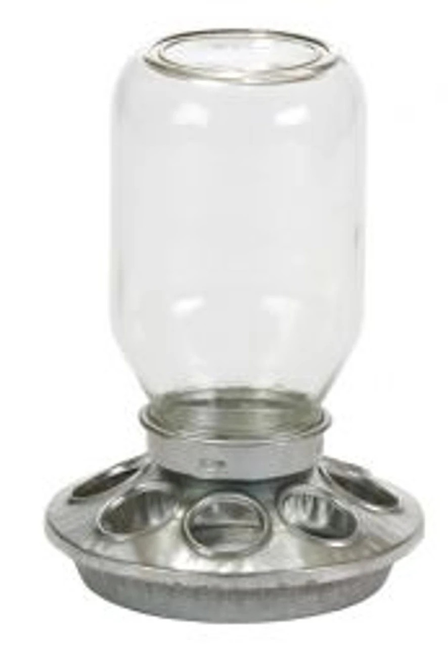 This gravity chick feeder comes fully assembled and features a glass mason jar. Easy to fill and clean, it holds 1 quart of feed. The base is made of heavy-duty galvanized steel with rounded, embossed edges to help reduce chafing on a chick’s neck and head. Base includes eight feeding holes.