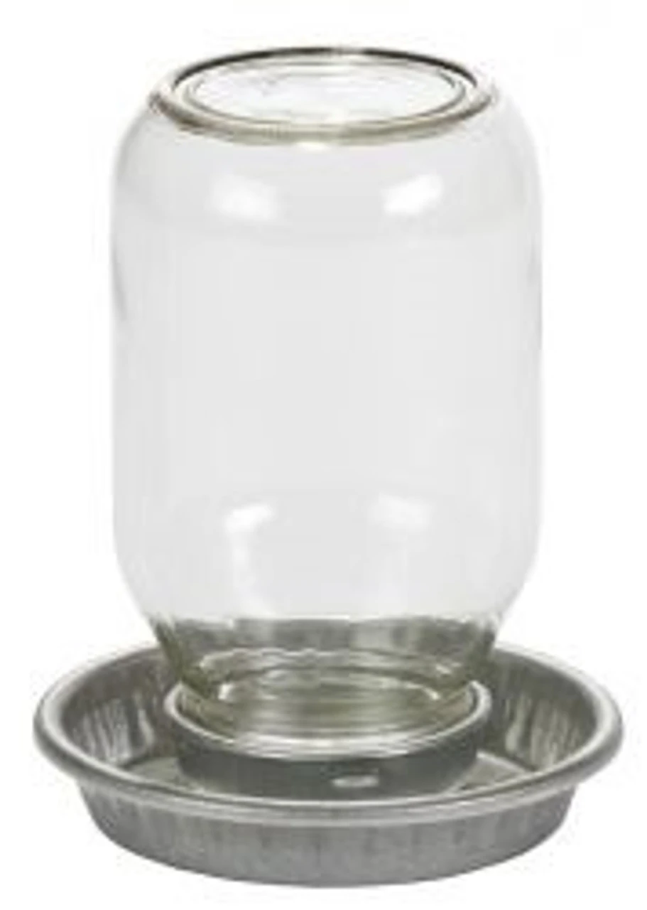 This gravity chick feeder comes fully assembled and features a glass mason jar. Easy to fill and clean, it holds 1 quart of feed. The base is made of heavy-duty galvanized steel with rounded, embossed edges to help reduce chafing on a chick’s neck and head. Base includes eight feeding holes.