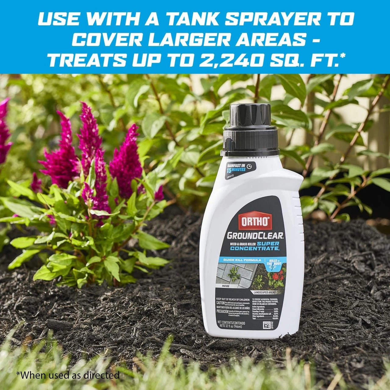 Apply this powerful weed and grass killer around landscape areas, patios, walkways, and driveways. A single application controls most listed weeds. Rainfall or watering 15 minutes after application will not reduce the effectiveness of this powerful weed control. Easily apply to weeds and unwanted grasses with an Ortho® tank sprayer. When mixed as directed, each 32-oz. bottle of concentrate creates 6.4 gallons of weed and grass killer to treat up to 2,240 sq. ft.