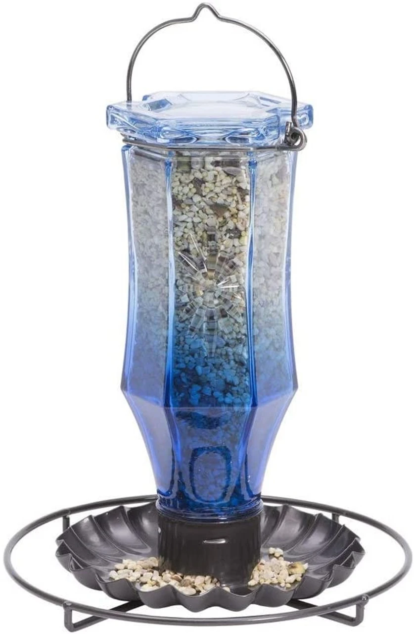 The Perky-Pet feeder comes fitted with an integrated decorative hanger for easily hanging it from a tree branch, trellis, tall shepherd’s hook, or any location that gives you a clear view of hungry birds flocking to your feeder. The glass bottle’s wide-mouth opening unscrews easily from the lid/metal tray for thorough, routine cleaning and mess-free filling. Even more, the metal tray includes drain holes that prevent water from pooling, helping to keep bird seed fresh and dry.