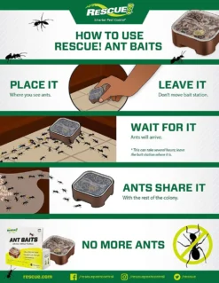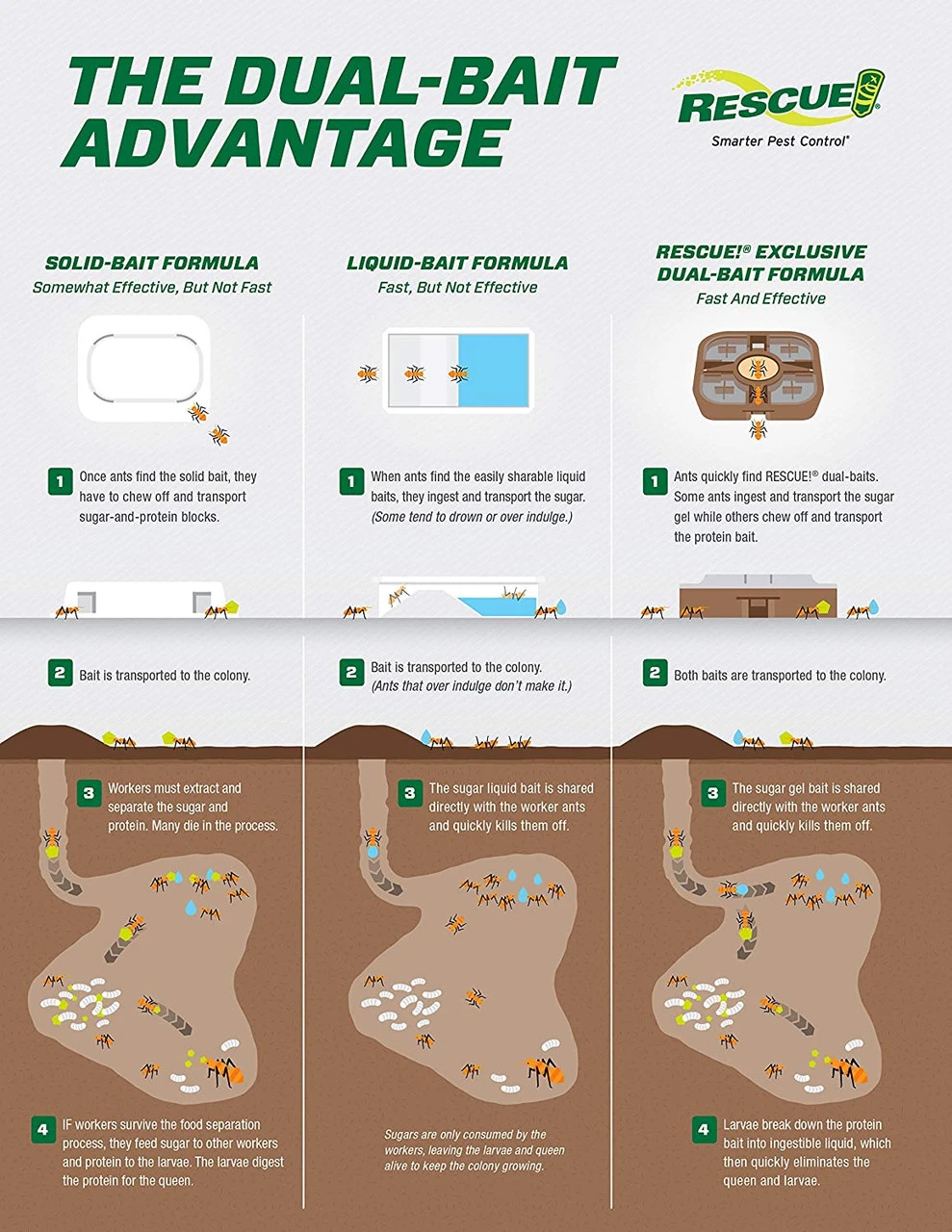 - YEAR-ROUND ANT KILLER – Each RESCUE! Ant Bait provides sugar gel and protein bait, killing more ants in every season. Our bait is more effective at killing ants than sugar ant traps and liquid sugar baits. More members of the colony consume the borax ant killer bait faster with RESCUE!.